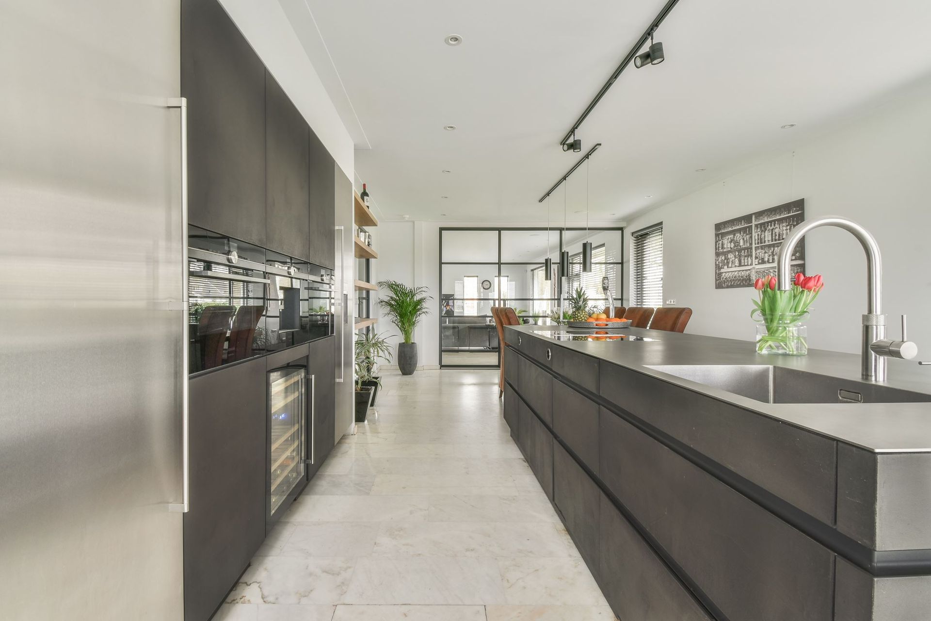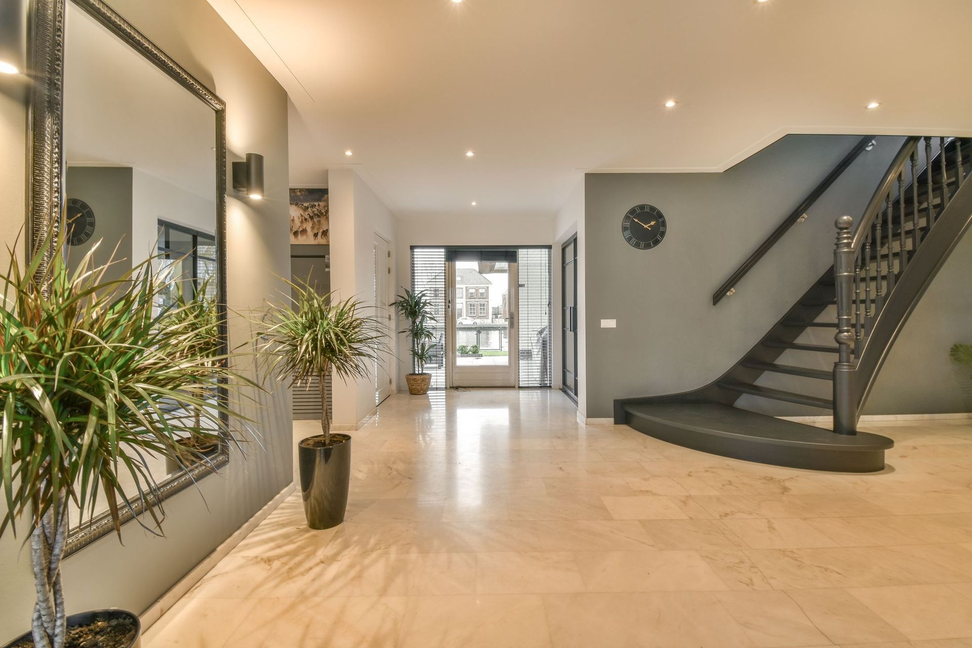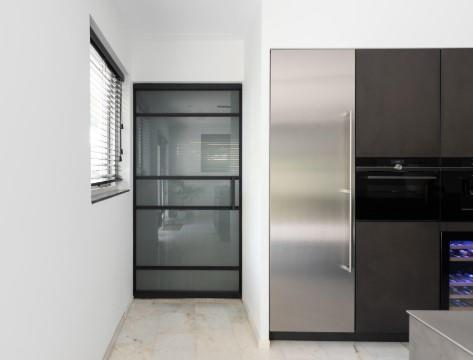 De begane grond van deze riante villa is grondig gerenoveerd. De gesloten kamers maakten plaats voor een open indeling, waarbij stijlvolle stalen en glazen deuren de verschillende ruimtes met elkaar verbinden. Het resultaat is een lichte, elegante woonlaag waarin de vertrekken naadloos in elkaar overlopen.