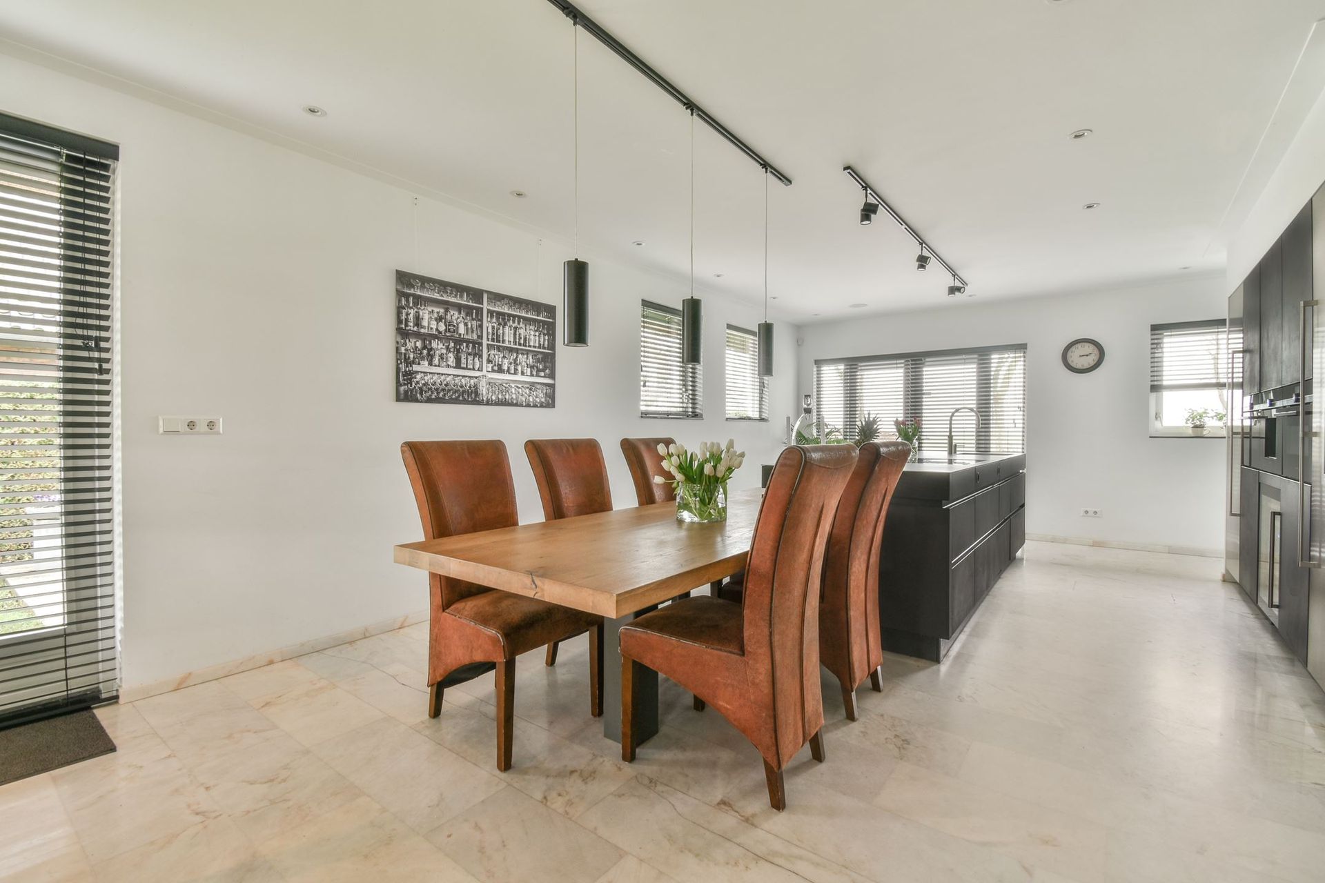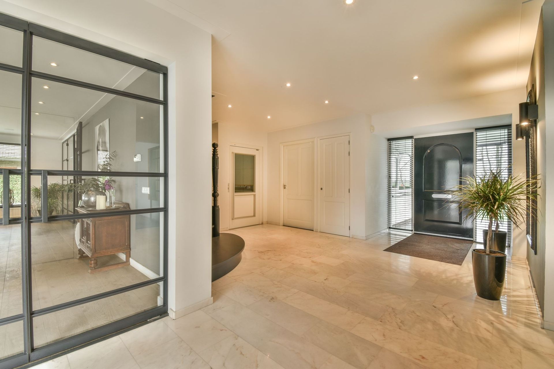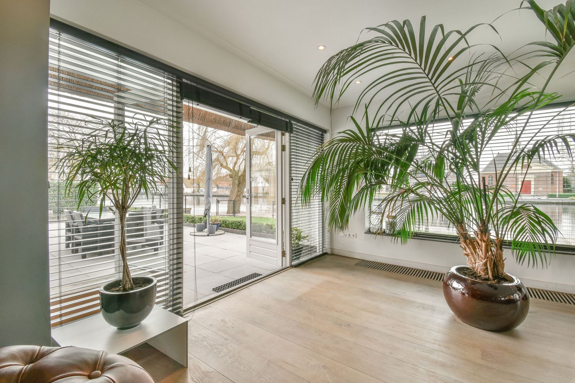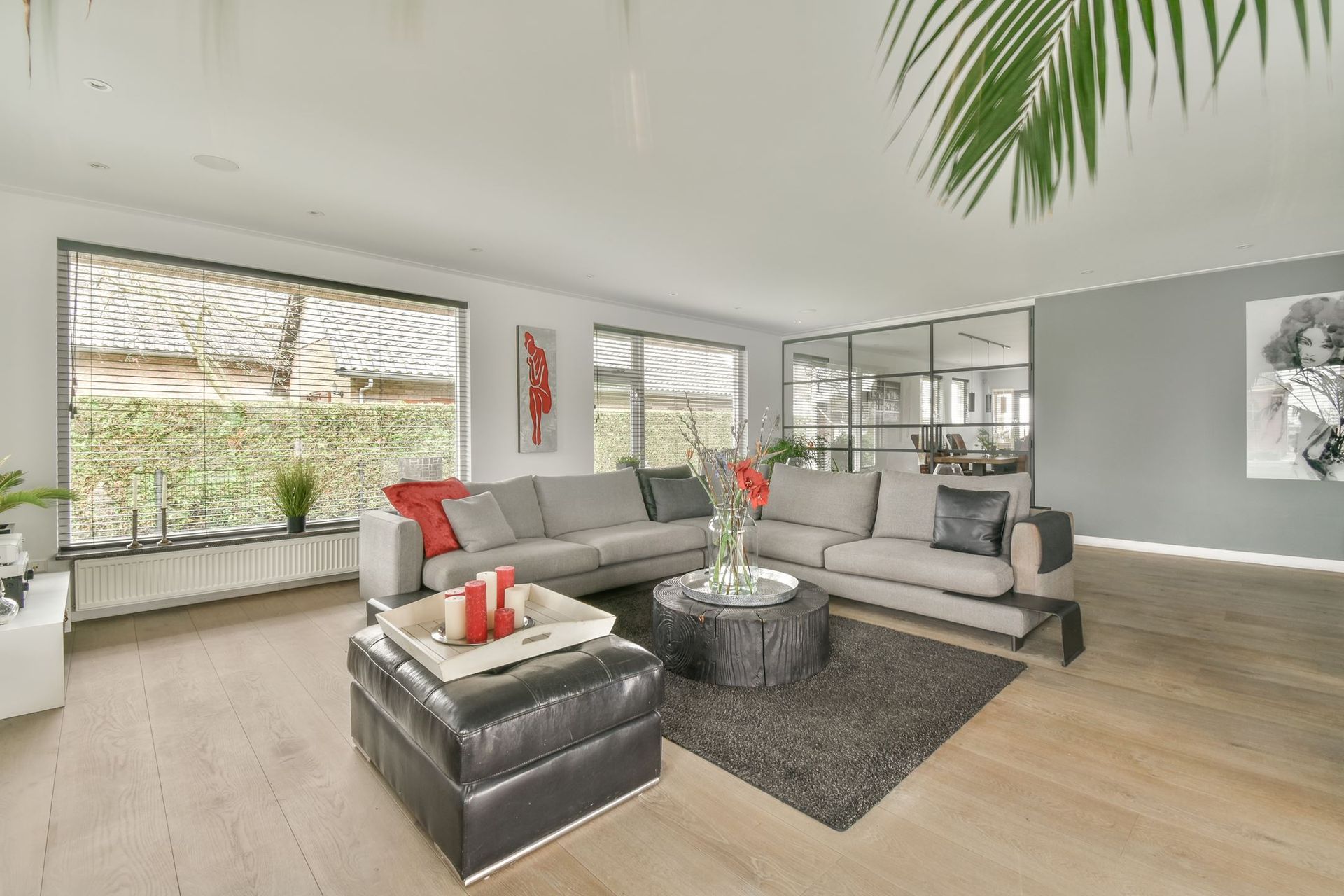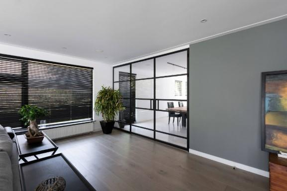 The ground floor of this spacious villa has been thoroughly renovated. The closed-off rooms have been replaced by an open layout, with stylish steel and glass doors connecting the different areas. The result is a bright, elegant living space where the rooms flow seamlessly into one another.