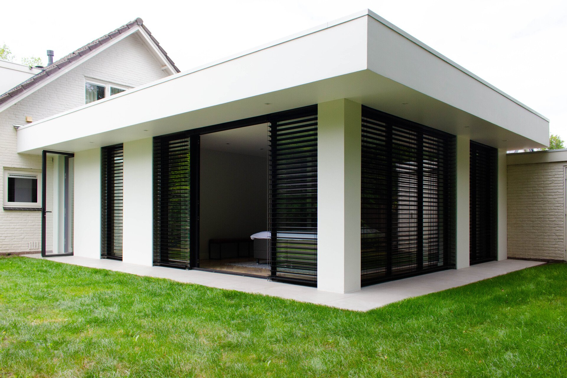 An extension with a bedroom, bathroom, and a 'walk-in closet'. The extension will be connected to the existing house with a skylight. The skylight has built-in cabinets and is also a direct connection from the parking space to the garden."