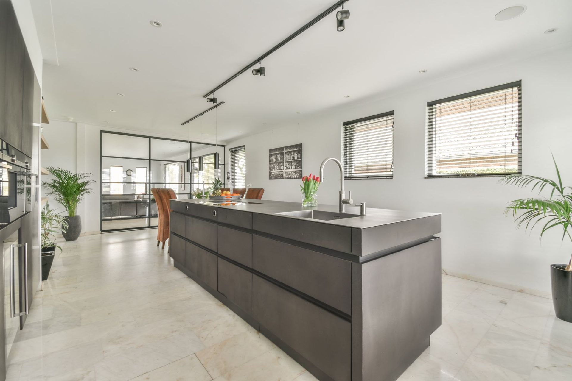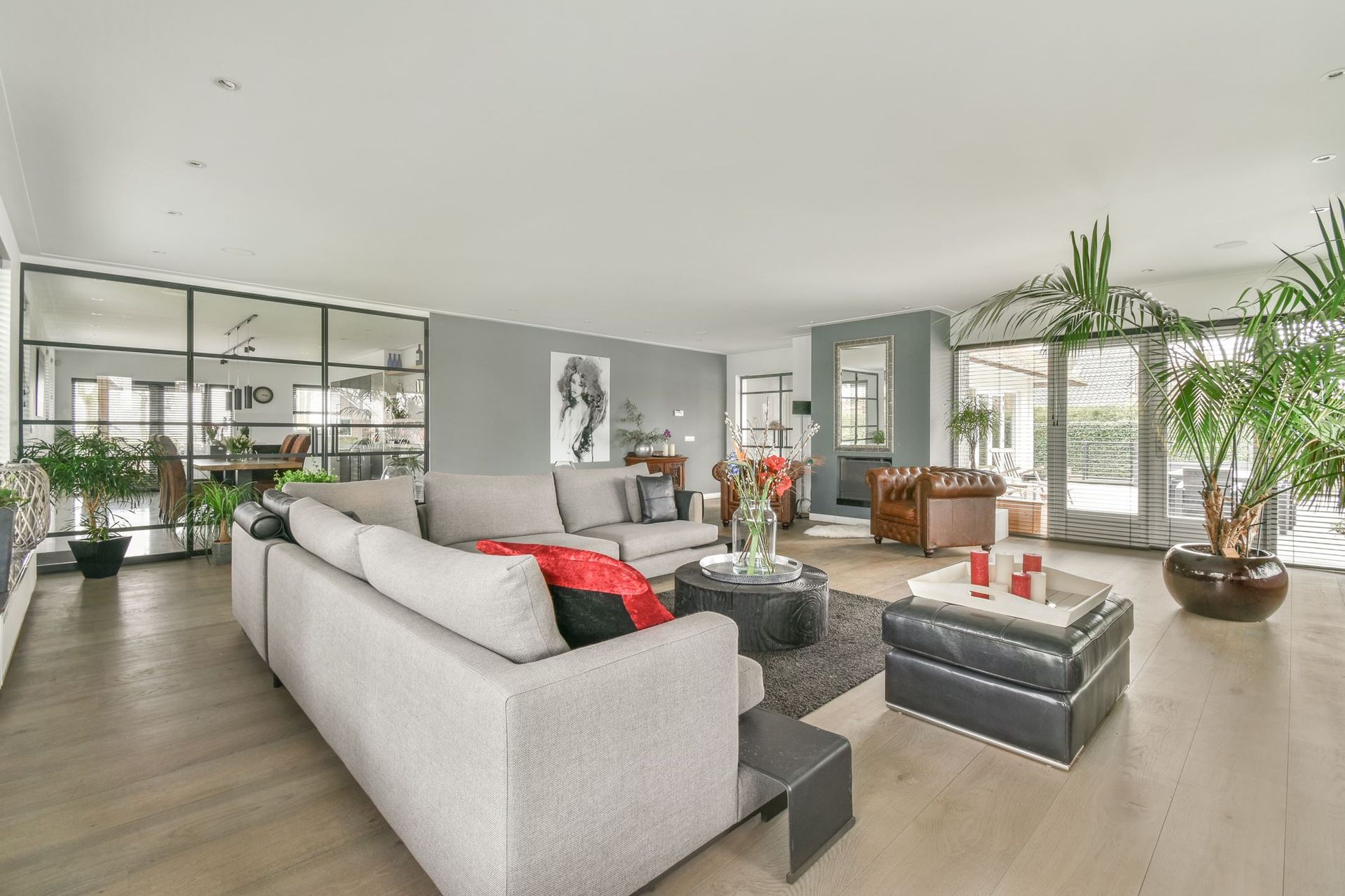 De gesloten ruimten van de woonlaag werden opengebroken en met elkaar verbonden met stalen/glazen deuren.